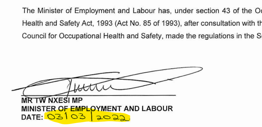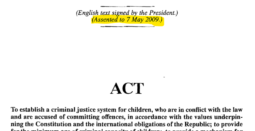 La date de signature par l'autorité compétente (le président pour les lois et un ministre pour la législation subsidiaire). Cette date figure généralement en haut ou en bas de l'acte législatif.