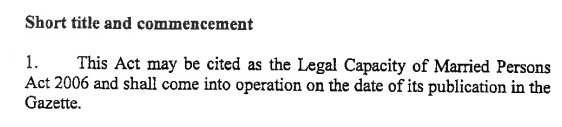 Cette section indique (comme ci-dessous) que la date d'entrée en vigueur est la date de publication dans la Gazette, ou que l'entrée en vigueur sera annoncée à une date ultérieure par la publication d'un avis dans la Gazette, ou encore qu'elle ne dit rien sur la date d'entrée en vigueur. Dans ce dernier dossier, la date d'entrée en vigueur est supposée être la date de publication dans la Gazette.